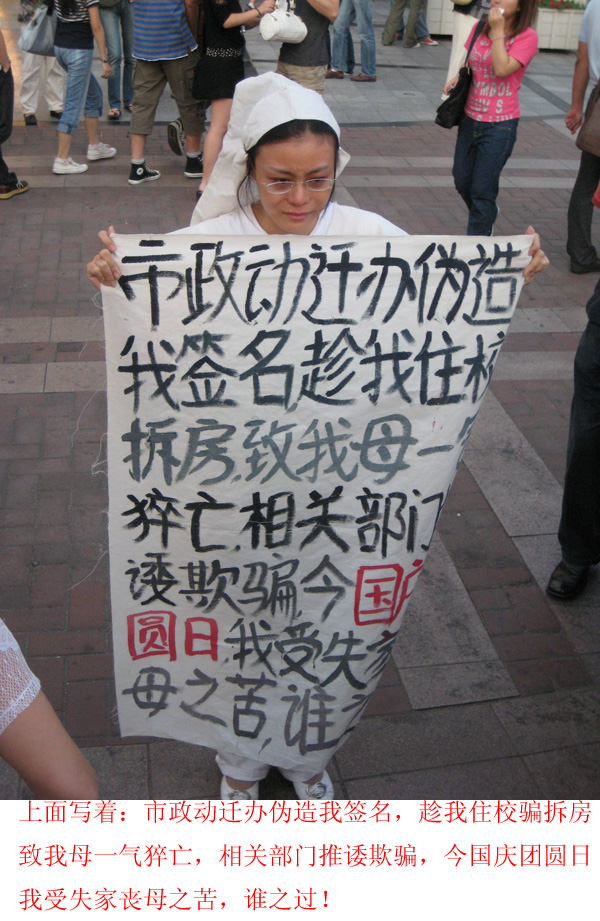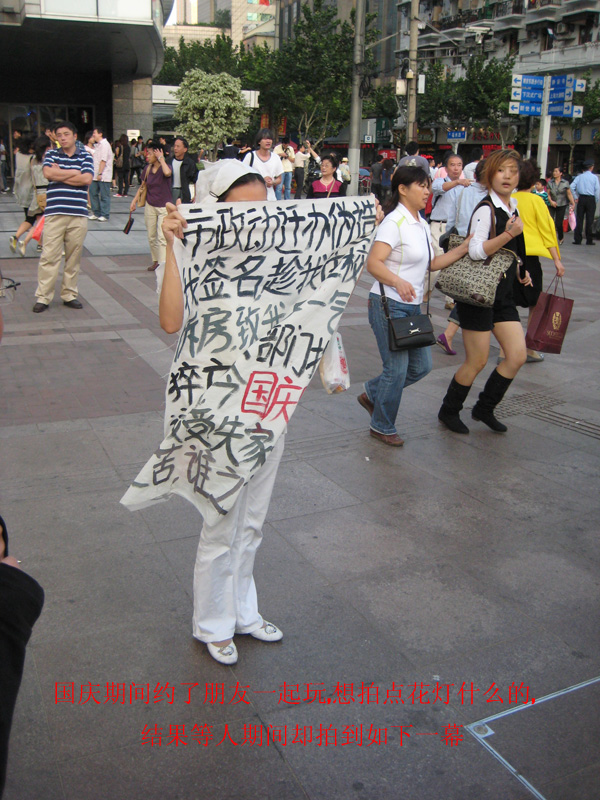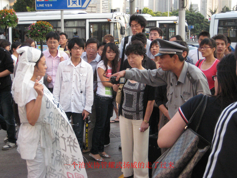 可惜我自己的照相机被偷了,那天用的是刚借来的,找了半天没找到录音,人多也没全听清楚,有那么几句大概是这样"你们这样粉饰太平,难道事情就会不存在么?","他们害我家破人亡,他们没有罪,我在这里说出这个事实我却有罪",记不得多的了,写着没什么感觉,听过绝对超震撼的,有点垂死挣扎的悲鸣的感觉.我当时都有点那个什么了.