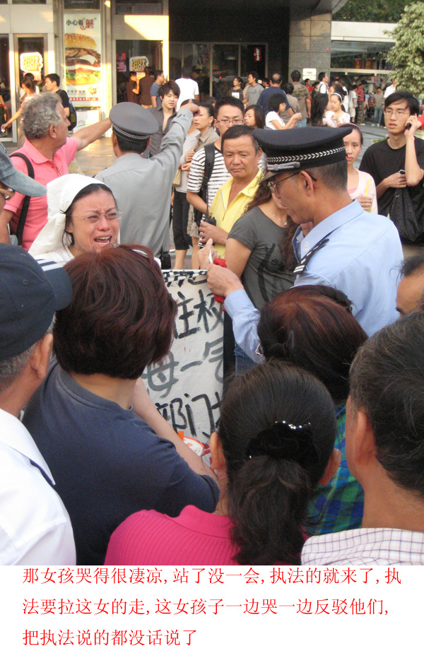 那女孩哭得很凄凉,站了没一会,执法的就来了,执法要拉这女的走,这女孩子一边哭一边反驳他们,把执法说的都没话说了.