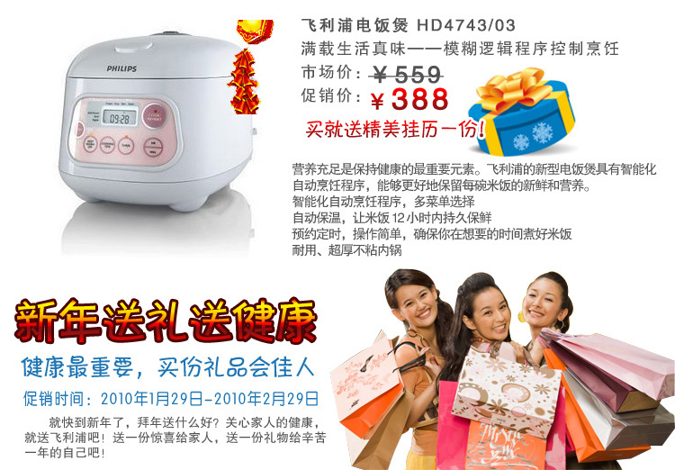 新年快到了,又到各位亲们对家人表达孝心、爱心时候到了,送他们一份健康的礼物,送上祝福一份吧!从2010年1月19日起至2月29日,我店推出飞利浦产品的优惠大酬宾活动。超值抢购哦!有买有送!我们的价格是全城最低的哦!全城产品不但可以自用,且是送亲朋戚友的最佳选择。 抢购网站是:http://shop59239824.taobao.com/ 超值网站:http://shop.paipai.com/1127822779/