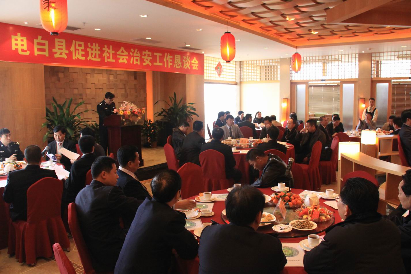 2月16日(农历大年初三)上午,电白县治安促进会在海景湾国际大酒店二楼茶艺馆,举行电白县促进社会治安工作恳谈会。邀请电白籍县内外知名企业代表和热心社会治安人士共40多人欢聚一堂,共叙乡情,共谋发展,共筑平安。县委书记、县人大常委会主任李日添,县委常委、常务副县长庞进生,县委常委、政法委书记、公安局长徐华喜,县公安局领导班子成员参加了这次恳谈会。