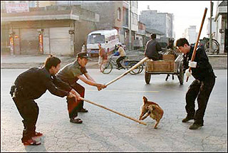 谁家的疯狗?赶快捉回去人道毁灭,免得乱咬人。听说狂犬病发作无药可救哦。