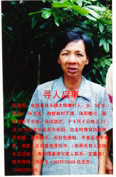 励志电脑服务 幼儿园 注册 2009-12-29 消息 12 反馈评分 0 点数 0 年龄 43 2010-04-09 #1 急急……寻人启事,朋友请帮个忙……谢谢 今天听到一个很不好的消息,十几年老同的母亲走失了,知道这事心里很不是滋味。我们虽没有血缘关系,但我们是十几年的同学,如兄弟姐妹般。我身在广州,没能够亲自去寻找,但应该尽自己的心,尽自己的力,如此才能不枉为老同。希望这是虚惊一场,有惊无险。妈妈早日回家…… 各位同学朋友若有这方面的消息请告知,万分感谢…… 详细消息如下: 附件 林花母亲副本.jpg 296.8 KB · 查看: 642