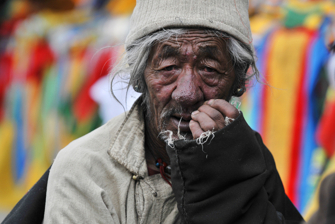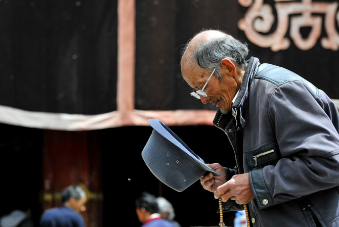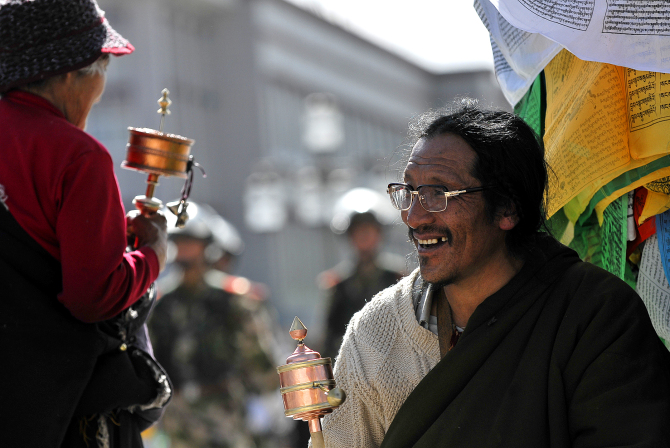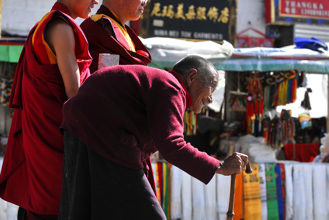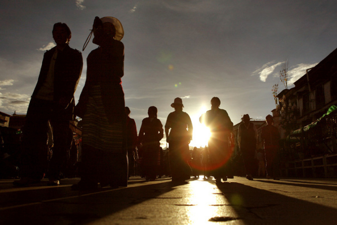 西藏跟内地有二个小时的时差,拉萨几乎晚上八点半天才黑,七点钟的大昭寺四周人头攒动,夕阳毫不柔和的将转经人长长的影子打落在石板路上,无论是叩拜还是行走,每一个小的晃步都会在金色的石板上产生放大的浮动,由视觉神经传导到感知的认识上对藏秘又增加了几分光灵般的神圣