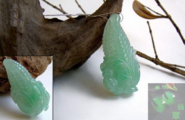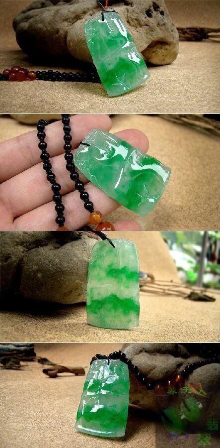 8.金丝种 金丝种指的是翡翠的颜色成丝状分布,平行排列,我们可以清楚看到绿色是沿一定方向间断出现的,当然绿色的条带可粗可细。 金丝种翡翠的档次要看它绿色条带的色泽和绿色带所占的比例多少,以及质地粗细的情况而定,颜色条带粗,占面积比例大,颜色又比较鲜艳的,价值当然高,相反颜色带稀稀落落,又浅色的就便宜多了,所以同样有高中低档。 高档金丝种挂件: