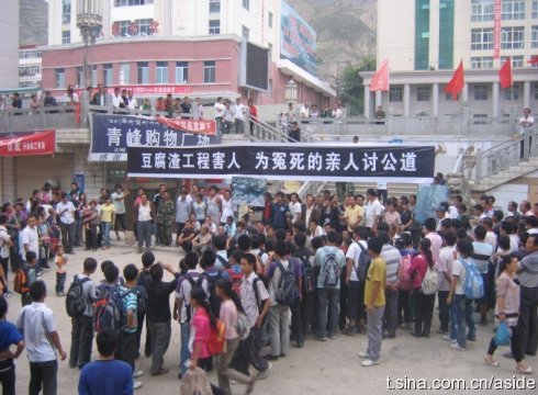 昨天,甘肃舟曲,县委政府人大政协门前。据说指的是拦洪坝。via@曹国星 [attachmentid=244818] 昨天上午,舟曲的村民们当着舟曲县长的面,把从拦洪坝上取样的水泥块,用手一捏,全成了面粉状。县长说,我们还要鉴定。下午他们在县政府广场上拉起横幅,三点多,县长出来劝散村民,并说,拦洪坝的工头已经被控制起来了。