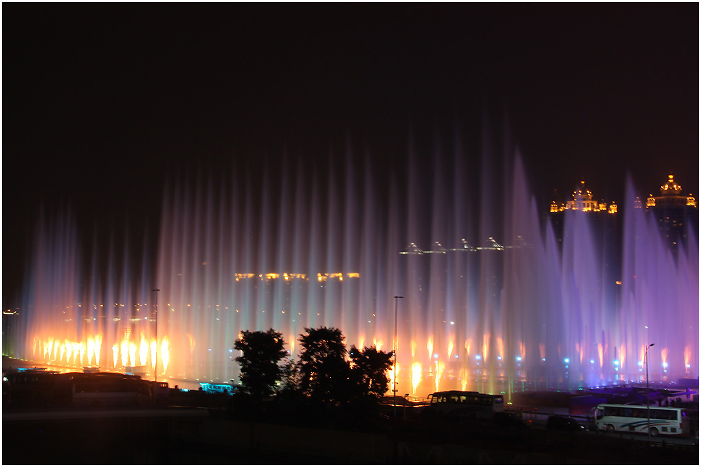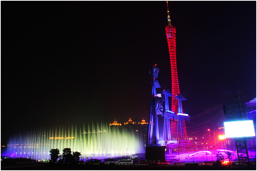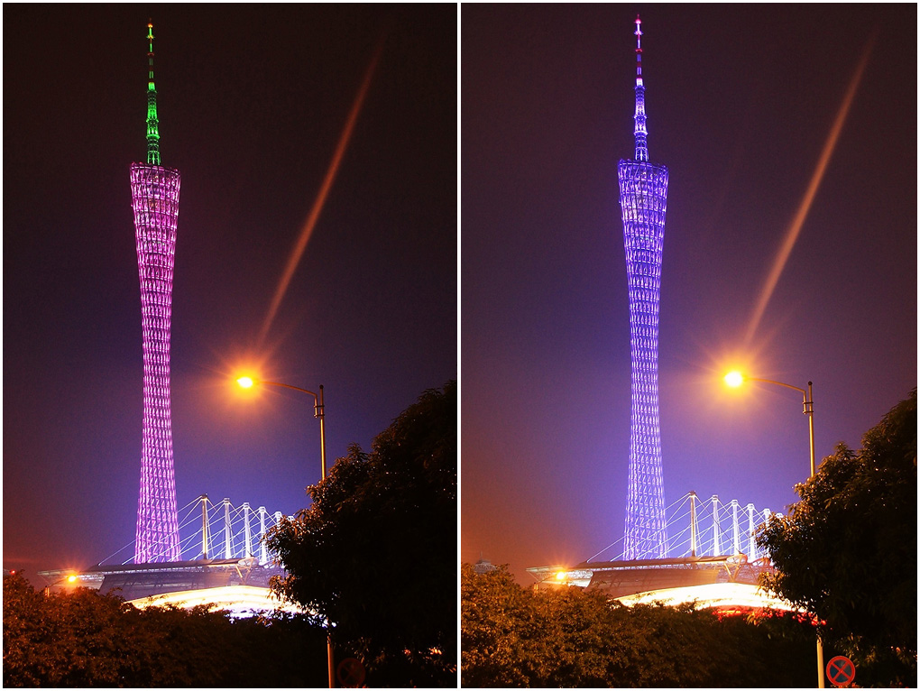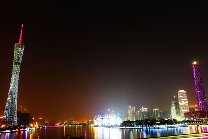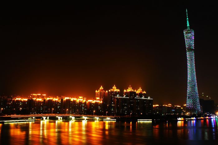 在夜幕下,红、橙、黄、绿、青、蓝、紫,各色交替变换的“小蛮腰”,姿态妖娆,美轮美奂。