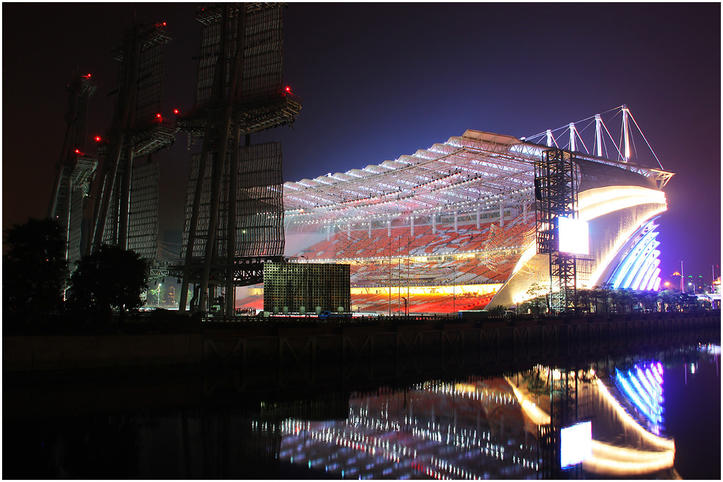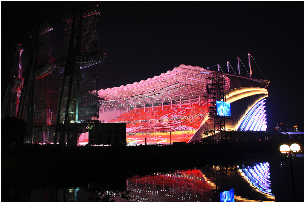 南都记者注意到,被设计成“三星耀天河”的体育中心夜景灯光也借昨晚首次亮相,外形酷似一只张开扇贝的体育中心中心足球场,“两只扇贝”不断呈现出魔幻般绚丽的彩光,而它东西两侧的体育馆和游泳馆则泛着淡淡的星辉似的光。海心沙岛的登岸码头是亚运会开幕式上运动员进场的第一站,南都记者也发现码头一侧的岛岸居然设计了一排“火树银花”:红色霓虹是树的躯干,树顶四散的“枝丫”全是银色的光柱。