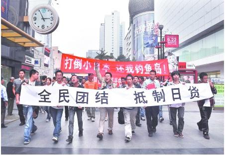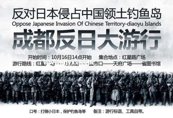 本站讯:自前段时间钓鱼岛撞船事件后,上海随即爆发反日游行活动,参与人数众多,民众情绪高昂。近日四川地区网络讯息传播,约定于2010年10月16日在成都举行反日游行活动。6 w! _2 t1 z" i8 I9 I2 D% b& Q