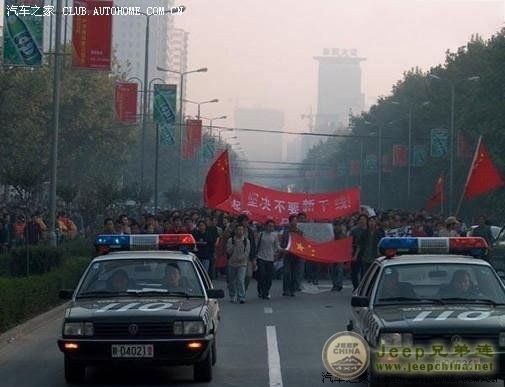 据现场目击者称,西安抗日游行活动由两辆警车开路,后面和周围都有武警保护游行的秩序,以防现场失控,保护人民的安全。