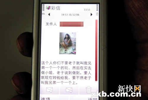 就在赎金寄出没多久,蔡先生收到一条彩信,里面的照片几乎令他窒息。照片中的阿娟神色呆滞,光着身子,仅抱着一堆花色布料遮羞,蜷缩在房间角落。房间墙上贴着张旧报纸,地上散落着薄被单和几件衣物。文字内容更是淫秽不堪,大意是威胁给钱。“他们不满足,要我当面给他三千,一手交钱一手交人。”蔡先生说。