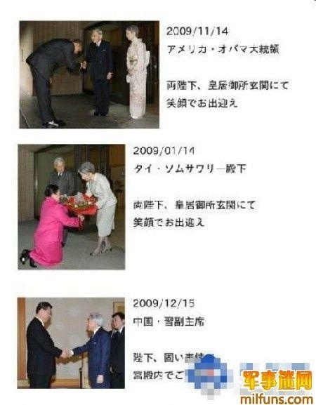 第一张:奥巴马 可以理解为尊重东方文化 第二张:泰国公主 比较像恶搞再仔细看第三张:习近平副主席会见日本天皇的相片,看习副气宇轩昂,天皇奴颜婢膝,俨然是一个大国领导接见小国领导,难怪日本国内会炸开锅呢。