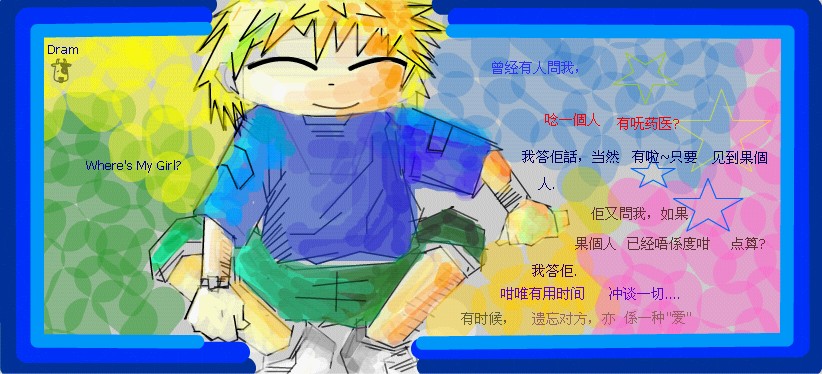 小曼蛙 ☜εїз...Leah's Dreams...εїз☞ 荣誉会员 注册 2004-12-05 消息 11,317 反馈评分 0 点数 61 年龄 40 2005-04-24 #3 这个算不算呀。 在SIm涂鸦留言板画的。 附件 tu.jpg 15.4 KB · 查看: 370