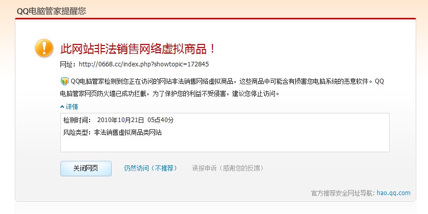 H hui8u8 幼儿园 注册 2007-10-18 消息 16 反馈评分 0 点数 0 2011-04-12 #1 这到底怎么一回事?打开论坛时,QQ管家竟报此网站非法销售网络虚拟商品?从而屏蔽了网站..奇怪了!!! 附件 1.jpg 56.3 KB · 查看: 313