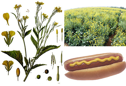 我曾很傻很天真地认为芥末酱(mustard)是以一种叫做芥末的植物为原料制作而成的,如同辣椒酱一样。但我错了(我的植物学老师,我对不住您啊 )。其实芥末是由成熟的芥菜( Brassica juncea )――十字花科芸苔属――的种子碾磨成的粉状调料,一般呈黄色。就是现在卖的3块钱热狗搭配的那一条黄黄的膏状物体。