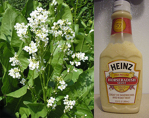 辣根植株照片,以及一瓶真正的辣根酱