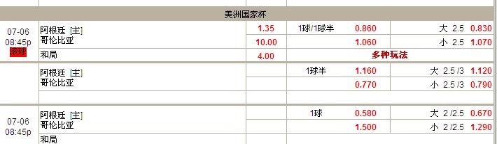 阿根廷VS哥伦比亚 球半/亚盘。。 1。03水。。