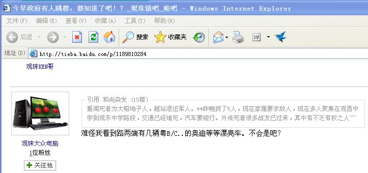 和 和尚染发 学前班 注册 2008-07-03 消息 58 反馈评分 0 点数 0 2011-08-27 #2 观珠有人跳楼,演变成堵路事件,武警下来了。 据闻死者为大榕坳子人,越站退伍军人。**昨晚抓了5人,现在家属要求放人,现在多人聚集在观西中学到观东中学路段,交通已经堵死,汽车要绕行。外传死者很多战友已过来,其中有不乏有权之人~~ http://tieba.baidu.com/f?kw=%B9%DB%D6%E9&fr=wwwt