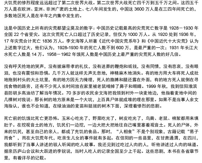 1958年至1961年死于饥荒的3500万至4000万中国人进行了细致入微的描写,这种以编年体呈现的描写无可辩驳。这本书给出了执政党――中国共产党长期以来都想要掩盖的那场悲剧中的细节。