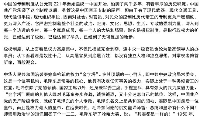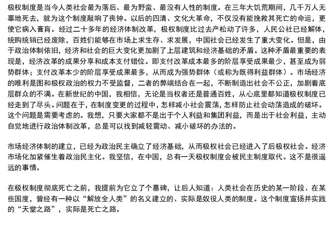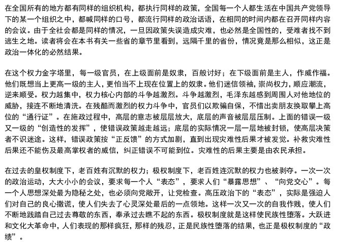 我上一次和杨继绳谈到《墓碑》的时候,他总结了中国和党的演化,这些话在我的脑海中挥之不去。他说:“这个体系在腐烂,这个体系也在演变。它一边演变一边腐烂。还不清楚最终哪一面会占上风。”
