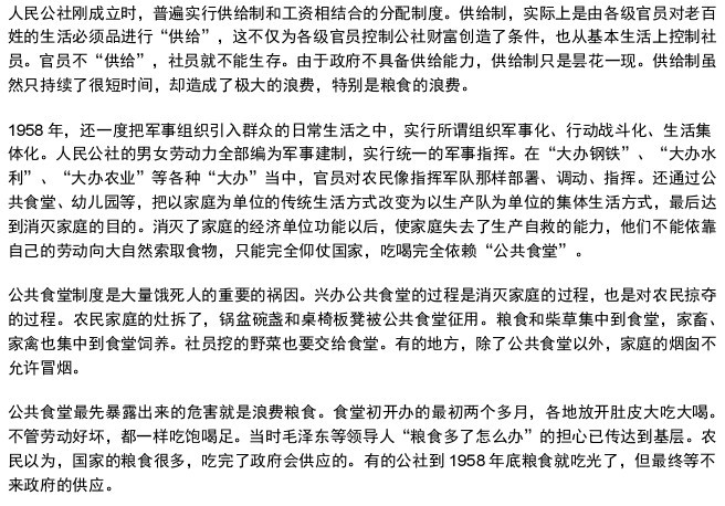 在50年代后期,毛下令让中国的农田都变成“公社”,让许多过去生产粮食的农民都去“土法炼钢”。这是“大跃进”的一部分,毛的幕僚们预测粮食产量会翻一番,甚至在几年内会增长三倍,而钢产量将很快超过西方发达国家。新的农村合作社开始用夸大其辞的假丰收来迎合毛对粮食产量创纪录的要求。国家再按照这些夸大的数据征收粮食,普通人很快就没什么可吃的了。