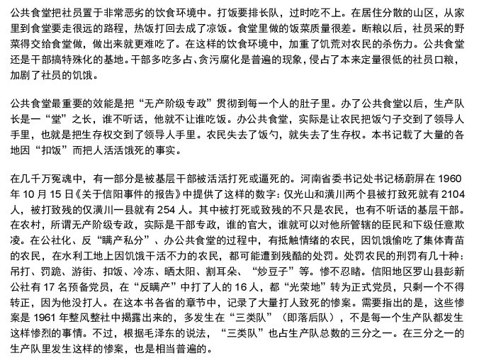 杨知道他的父亲已经垂死的那一刻,他记得很清楚。当时他是个十来岁的孩子,住在公社里的一名高中生。他也是共青团党当地支部的宣传委员,一名狂热的毛的支持者。杨当时正在为宣传“三面红旗”运动写板报,为“大跃进”和公社大唱赞歌,一位同学冲进屋里。“你爸快不行了,”这个男孩子说道。杨后来为没有能早点回家为家里人挖野菜而自责。那时候他没有想过要把责任归咎于毛泽东或共产党。这是一个个案,属于家里处理的事。30年后,他有了不同的想法。
