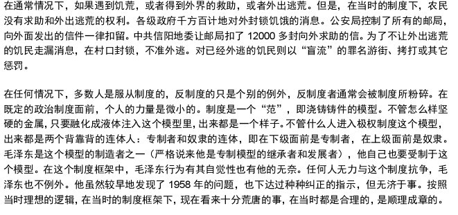 杨的史诗般的巨作证实的是所有在中国之外学习世界事务的学生都已知道的事实――毛泽东乌托邦式的计划本来是想加速建设他称之为的“真正的共产主义”,结果却造成了有史以来最悲惨的人为制造的饥荒。而杨继绳,作为新华社的一名记者――在官方的新闻机构中供职的一员,他是如何对此进行研究并写成此书的呢?这几乎和这本书一样非同凡响。