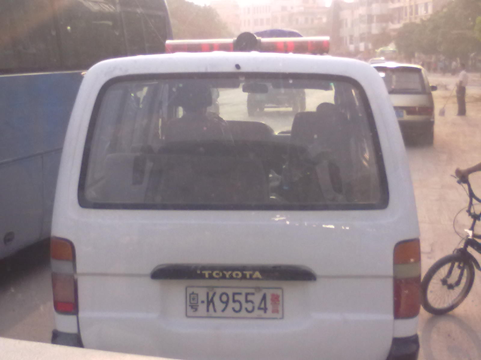 9月19日下午17:25分,在325国道回来水东的路上发现了,三角墟一带正在修路,车辆像蜗牛般的行驶着;突然,在电白交警大队门口见到了惊人的一刻,一部警车(车号:粤-K9554警)在修路的中间打横停着,心想,有交警来指挥交通,我不用塞车了;谁知那台警却是在修路的中间调头的;在车调头的那一刻给我看到了原来警车上,只有两个人:开车的是一个四十多岁的中年男人,穿着警服,连衣钮也不扣,露出那件白色的背心;旁边坐着一个,十二三岁的小孩子在玩着手机;