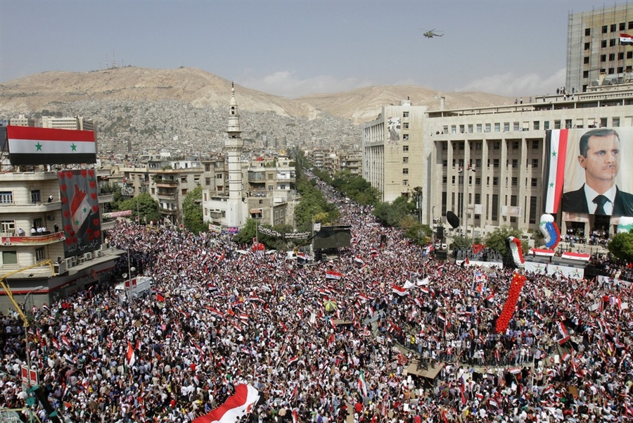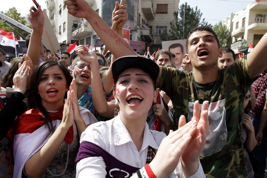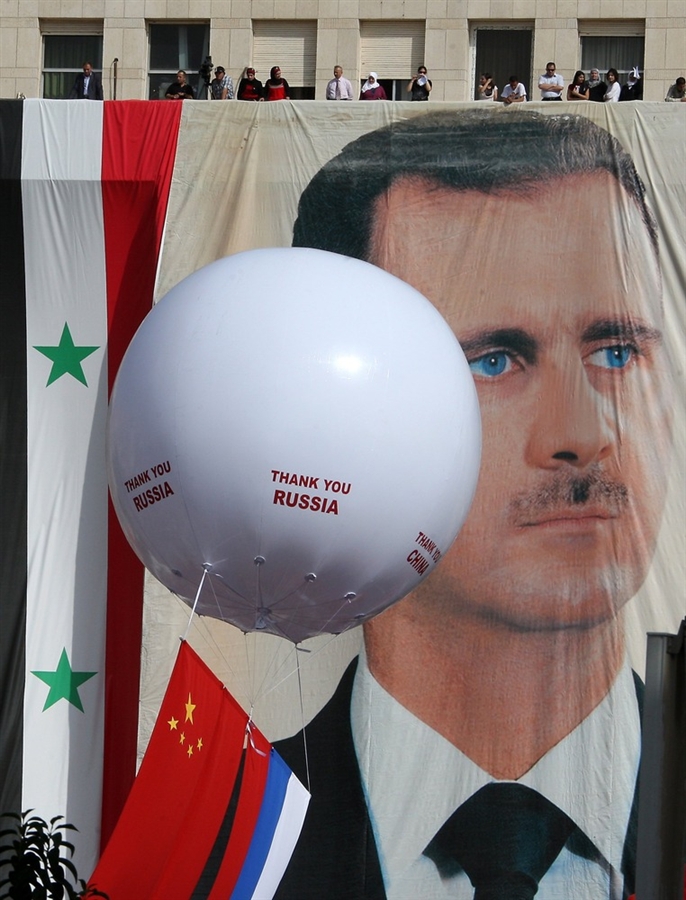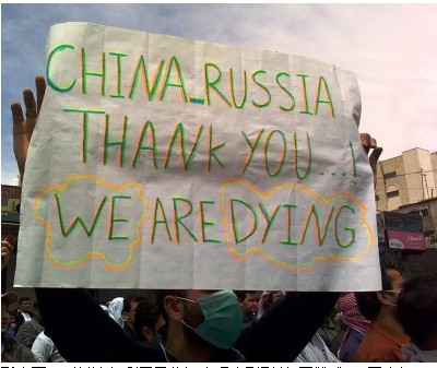 政府的反对者举标语:China,Russia,谢谢你们,我们正在死去