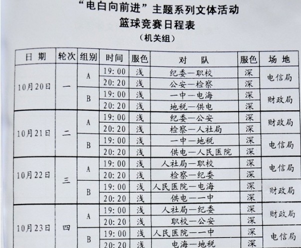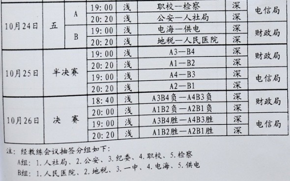 三、比赛日期: ㈠、机关组:2011年10月20日至10月23日 ㈡、镇级组:2011年10月26日至10月30日 ㈢、女子组:2011年10月26日至10月30日 四、比赛地点:各组比赛均集中在水东进行。