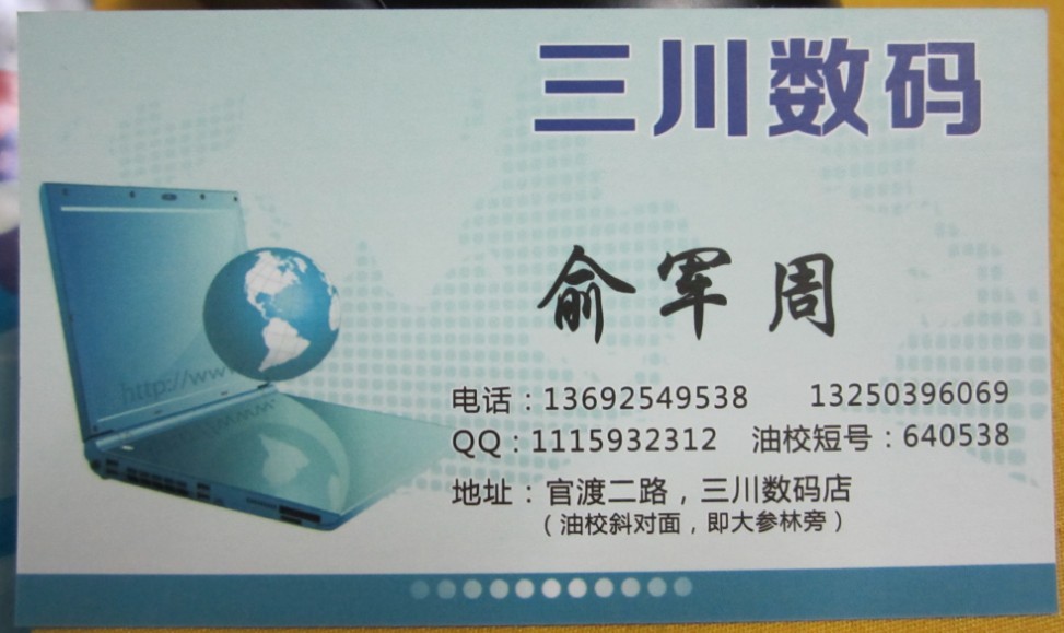 J junzhou1111 幼儿园 注册 2010-12-10 消息 24 反馈评分 0 点数 0 2011-12-17 #1 保证全新正品行货笔记本电脑,全国保修,想买笔记本的朋友可以上京东商城看好型号和价格,然后告诉我就行。不保证所有型号都有货,请提前联系,以确保有货 本店价格=京东价格*0.85 购买方式:预交50块定金,下单后一个星期内交货。 地址:(茂名)油校斜对面,三川数码店 电话:136-925-49538,QQ111-5932-312 附件 名片.JPG 94.5 KB · 查看: 425