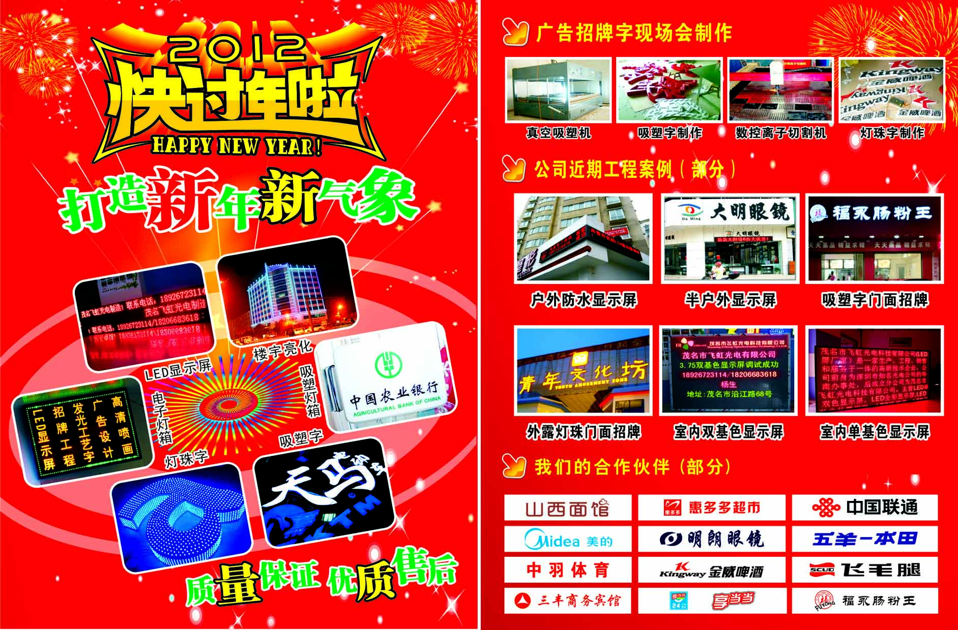 Y ygp841130 学前班 注册 2010-05-13 消息 32 反馈评分 0 点数 0 2011-12-24 #1 [attachmentid=287856]快过年啦,打制新年,新气象!我是茂名市飞虹光电的杨生,公司专业制作LED发光招牌,KTV亮化工程,LED电子显示屏制作、安装、维修,广告设计制作安装等!业务联系:18926713114/18206683618,地址:茂名市沿江路68号(沿江大酒店左侧)。如想知更多公司业务内容,可上百度搜索《茂名飞虹光电》打扰了! 附件 快过年了.jpg 462.5 KB · 查看: 320