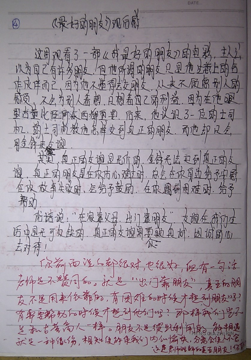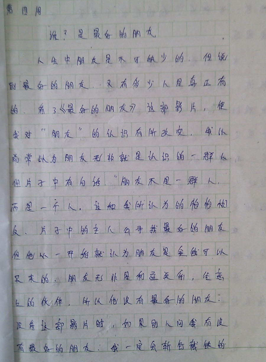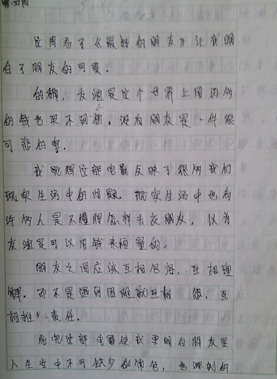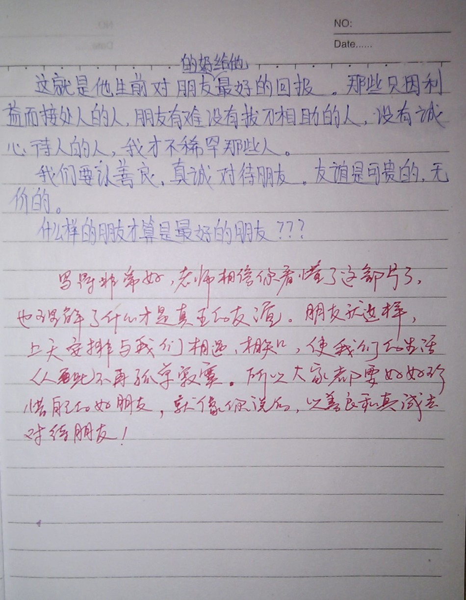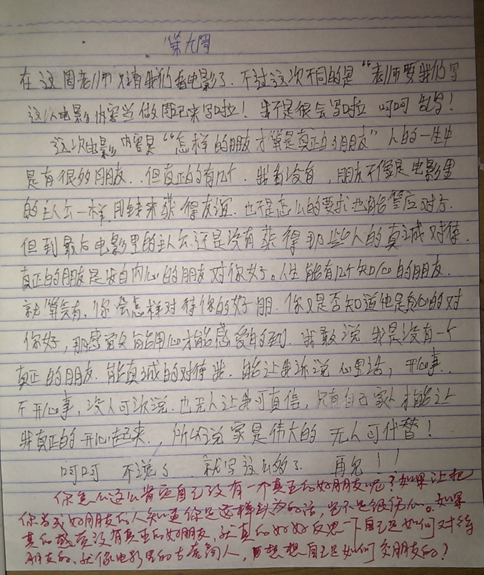 所以决定,也让学生们好好思考一下,关于“朋友”这个问题。因为拥有朋友对于一个人的人生真的很重要,尤其能拥有一份珍贵的友谊。抽了两节课要求认真地把电影看完。写一篇周记,内容就是看完电影后认真地写写自己的那些好朋友们。希望他们从现在开始,正确地对待朋友,从此拥有最纯洁的友谊,祝福他们和朋友们永远都过得愉快!