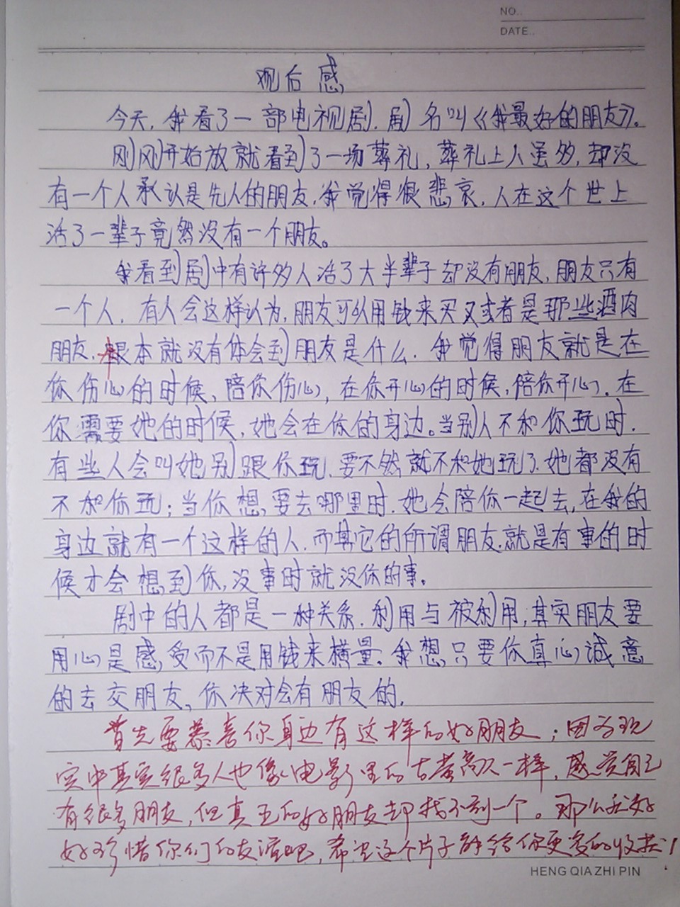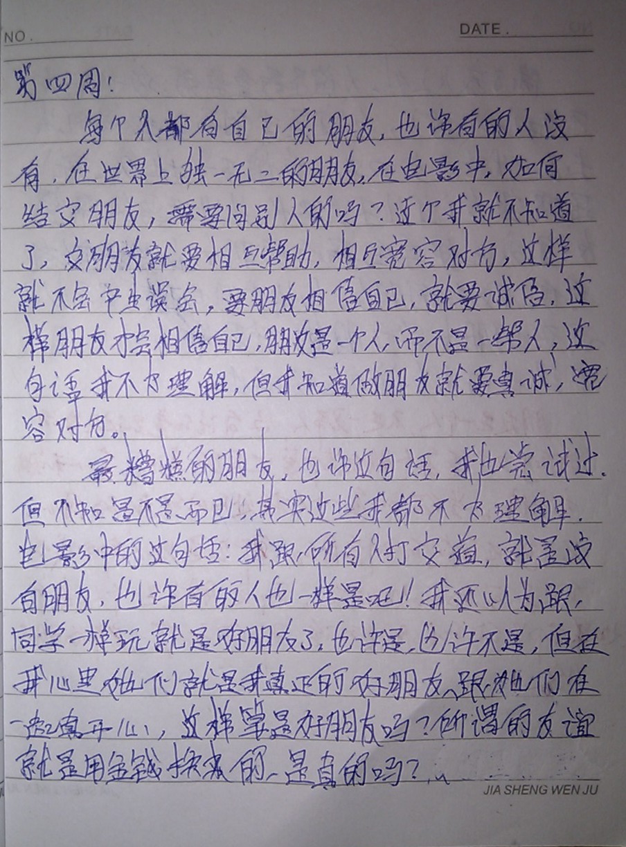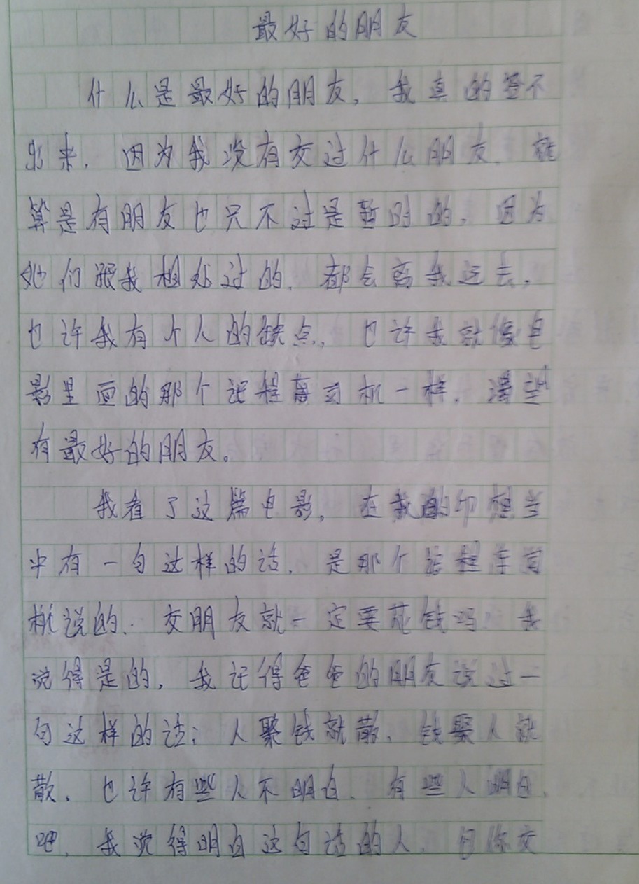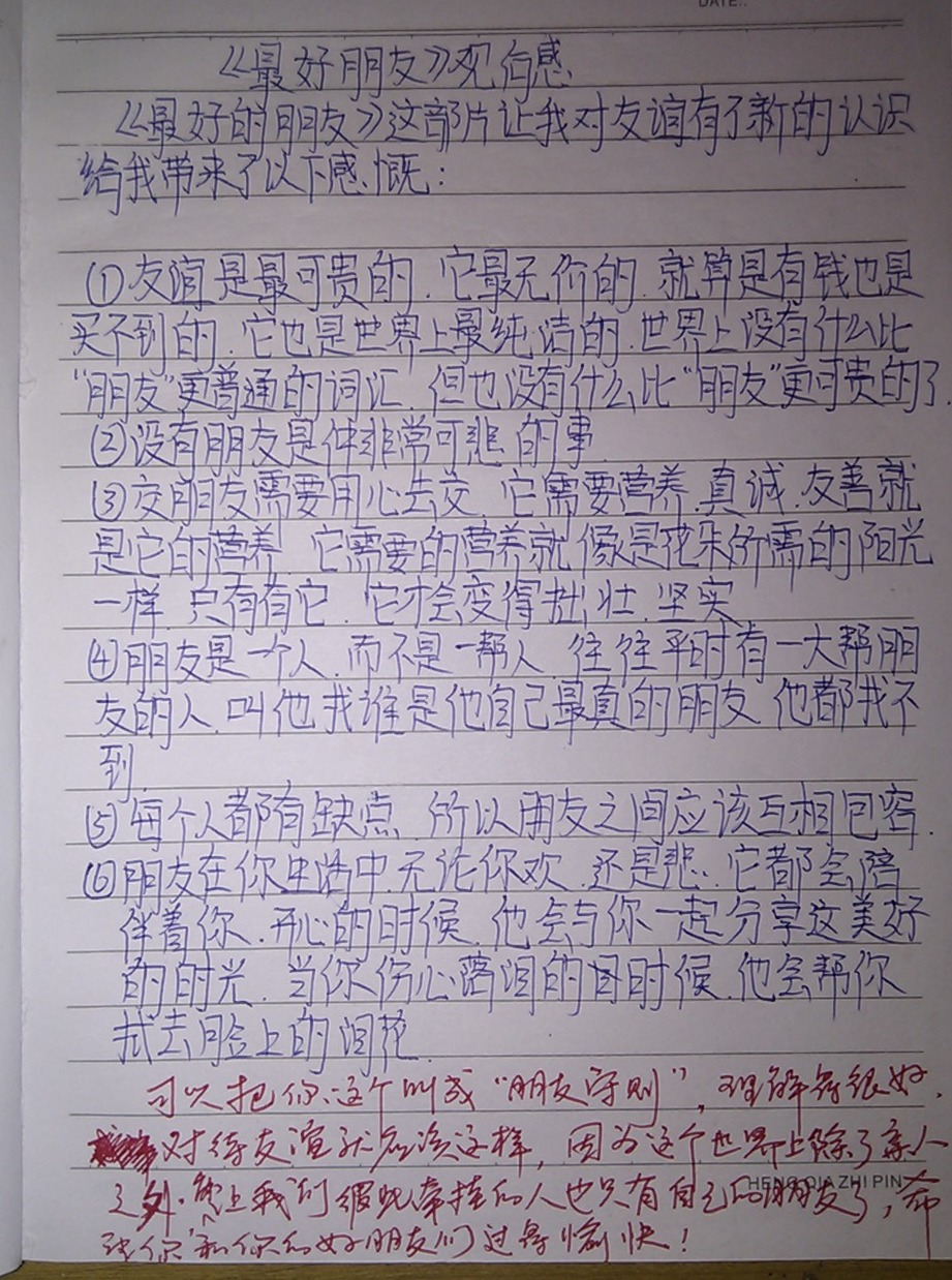 所以决定,也让学生们好好思考一下,关于“朋友”这个问题。因为拥有朋友对于一个人的人生真的很重要,尤其能拥有一份珍贵的友谊。抽了两节课要求认真地把电影看完。写一篇周记,内容就是看完电影后认真地写写自己的那些好朋友们。希望他们从现在开始,正确地对待朋友,从此拥有最纯洁的友谊,祝福他们和朋友们永远都过得愉快!