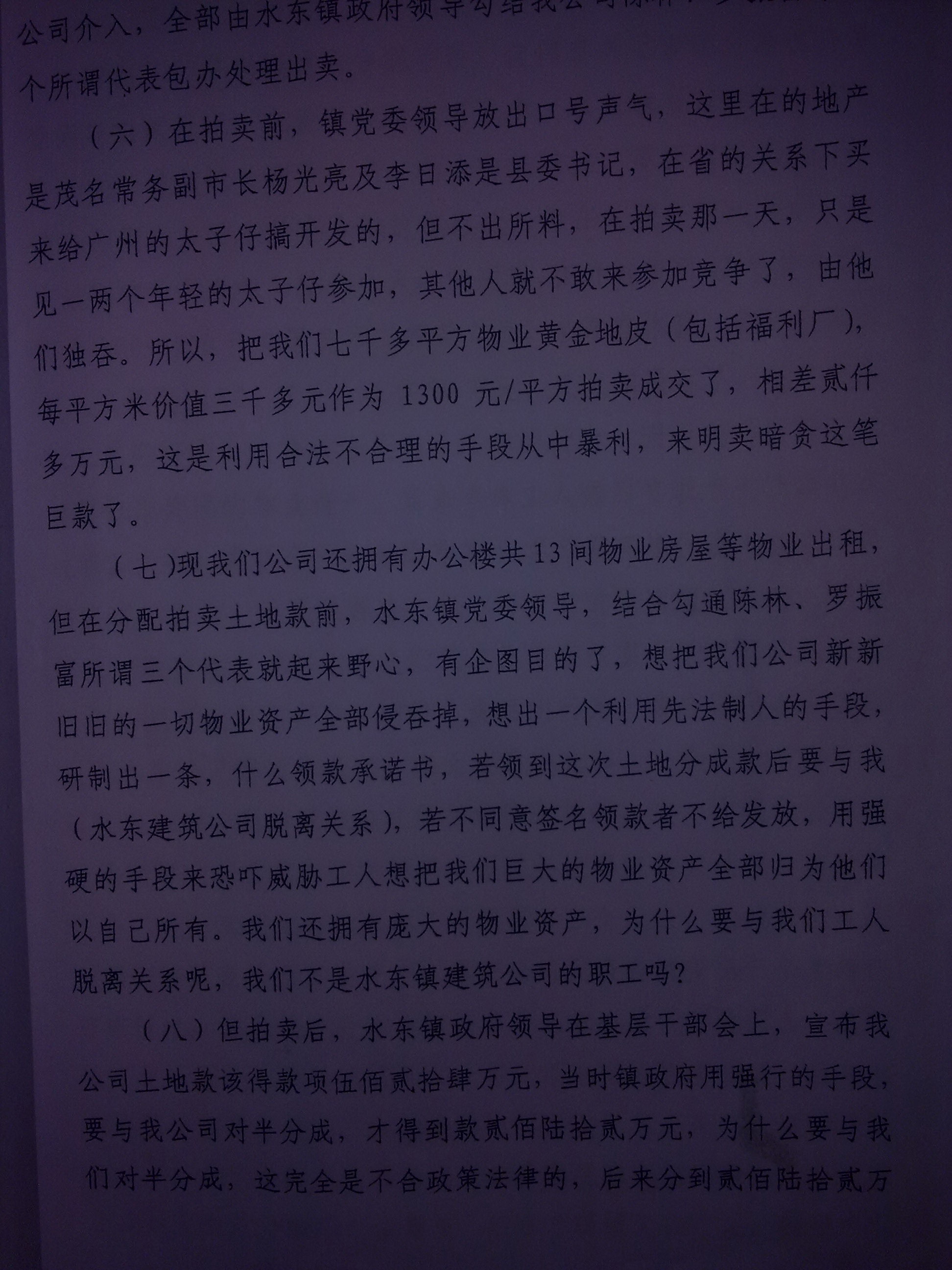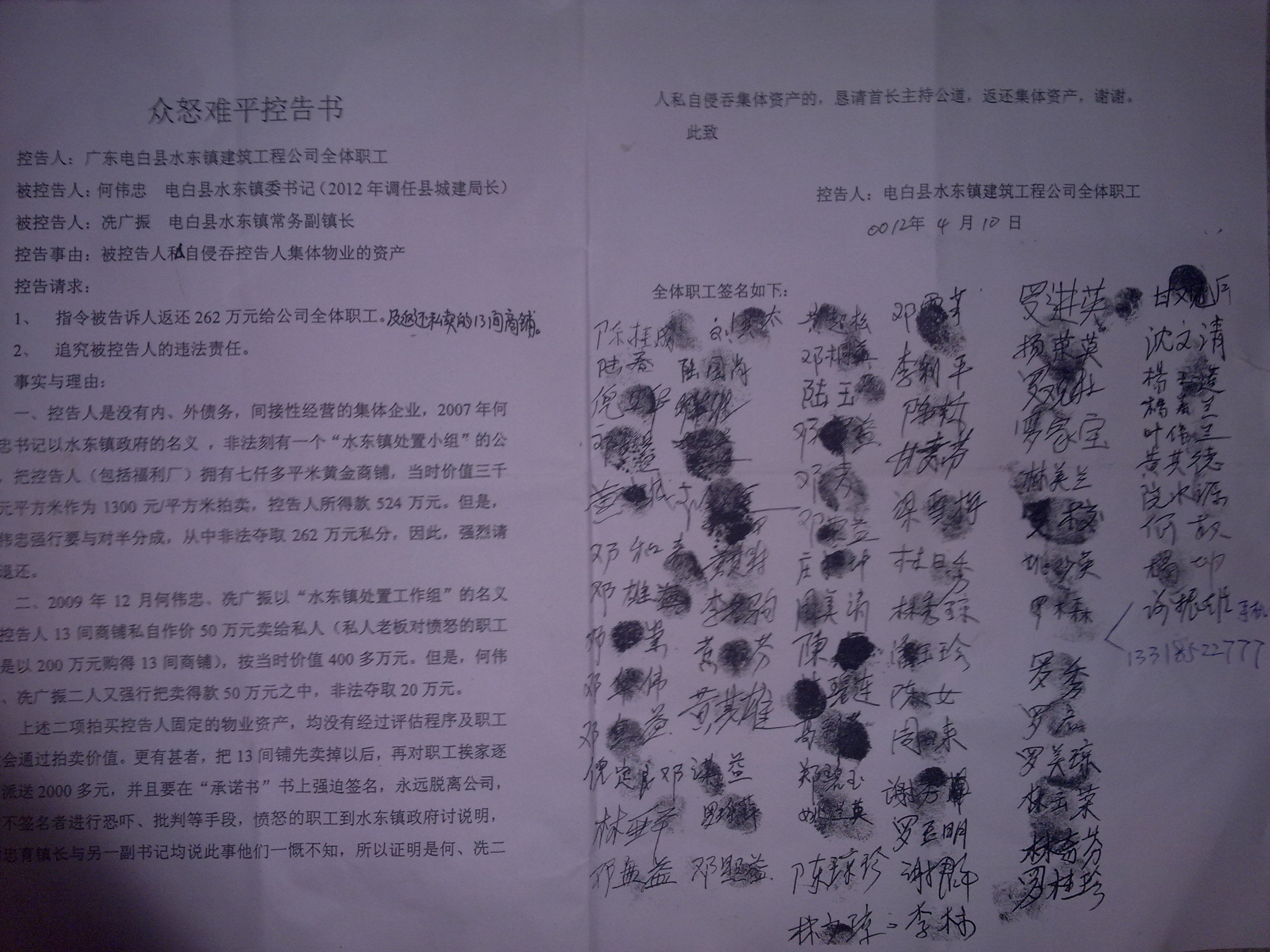 2007年何伟忠书记以水东镇政府的名义,非法刻有一个"水东镇处置小组"的公章,自作主张把我们(包括福利厂)拥有的七千多平米黄金商铺,当时价值三千多平方米作价1300\平方米拍卖,得款524万。然后何伟忠强行要与我们对半分成,从中非法夺取262万元私分。