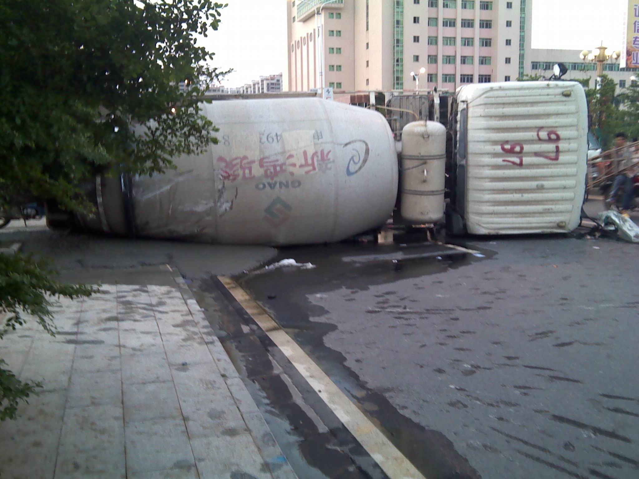 约6点30分,春华学校、加油站朝县府方向约800米,一辆载着水泥浆的水泥罐车在合富花园路口对侧道路侧翻,撞断灯柱后,再向前滑出20米,太恐怖了,不知是否造成伤亡。 迎宾路的交通事故频出,跪求整治。感觉应限在30公里时速内,不定点安装测速仪。 因车祸致死的人真的好冤。请铁腕向上级提出议案,解决迎宾路交通问题。非常感谢!