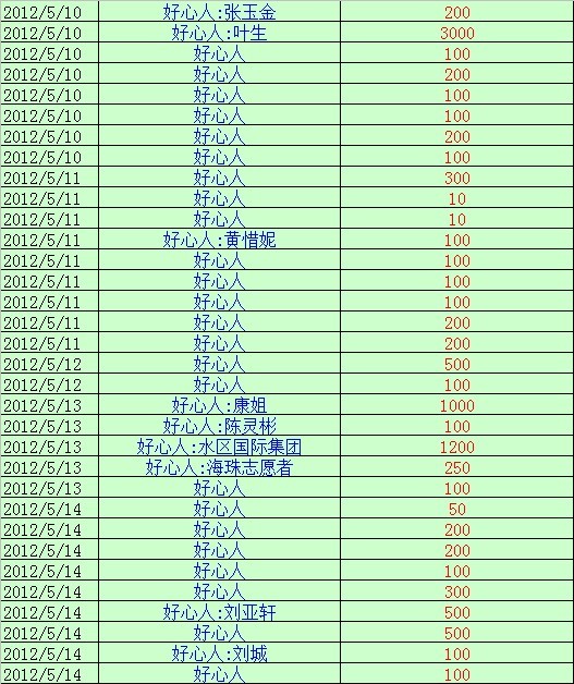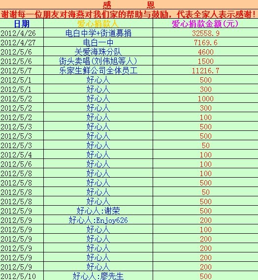 QUOTE(湖海山人 @ 2012年05月14日 Monday, 06:00 AM) 吴建波有责任反馈这件事情。 捐助人自己说出来,不如由受捐人说出来。、,这是对捐助人的尊重,除非捐助人要求不说的。 [snapback]3360182[/snapback] 恩,你们的建议很好,以前都没有这样的经历,我疏忽了这些的细节,请各位谅解,以后我每天多收到的善款都会在论坛上公布出来,谢谢...