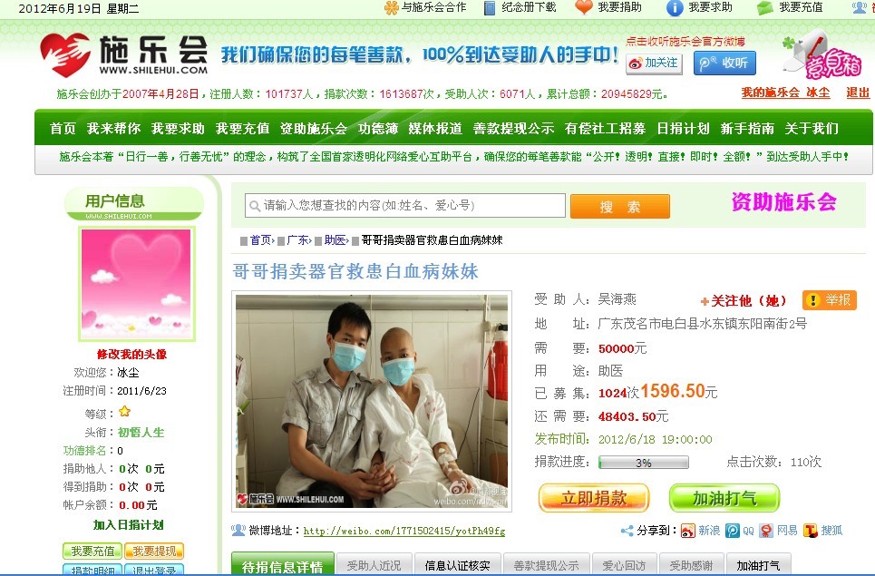 吴海燕的哥哥吴海波在光华市慈善总会旗下爱心网站施乐会递交了求助资料,有幸得到通过