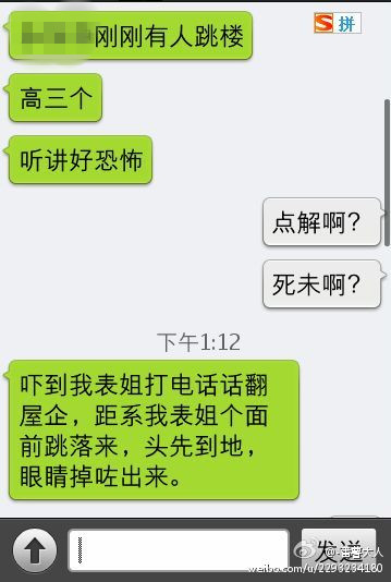 第 第六感 初中二年级 注册 2009-02-10 消息 481 反馈评分 0 点数 0 2012-08-07 #1 今天从微博得知一跳楼自杀事件,未经证实,大家先看看传闻吧 今天**中学发生了一名高三学生跳楼 的惨剧,他死前在腾讯微博发了一条说说 ,说学校的领导侮辱他,嘲笑他,想让他退 学,他要以死做鬼去找他们!一条十八岁 的青葱生命就此离去!究竟是怎么一回事 ,让一个孩子选择了死亡!还公道,求真相 [attachmentid=298787] [attachmentid=298786] 附件 手机_副本.jpg 51.9 KB · 查看: 486 951a8bc6gw1dvo5mfrincj_副本_副本.jpg 62.5 KB · 查看: 447