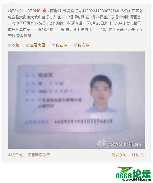 电白彩婷内衣 大学三年级 注册 2011-11-24 消息 849 反馈评分 0 点数 0 2012-08-28 #1 陈金凤 男 身份证号4409234198307274615汉族 广东省电白县大衙镇大坡山塘仔村人 在2012暑假时间 在8月24日在广东省深圳市观澜富士康电子厂吞食17名员工2个月的工资 还在后一天8月25日之时广东省东莞市横历成乐玩具电子厂吞食18名员工工资 总吞食工资约10万 将13名员工身份证丢失 至今带钱潜逃 转起 附件 1111111.jpg 124.8 KB · 查看: 206