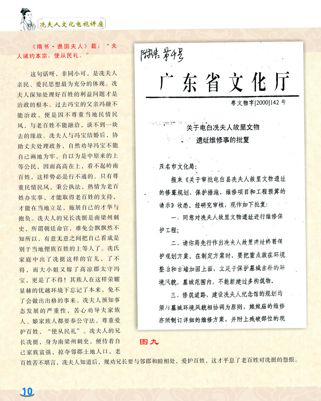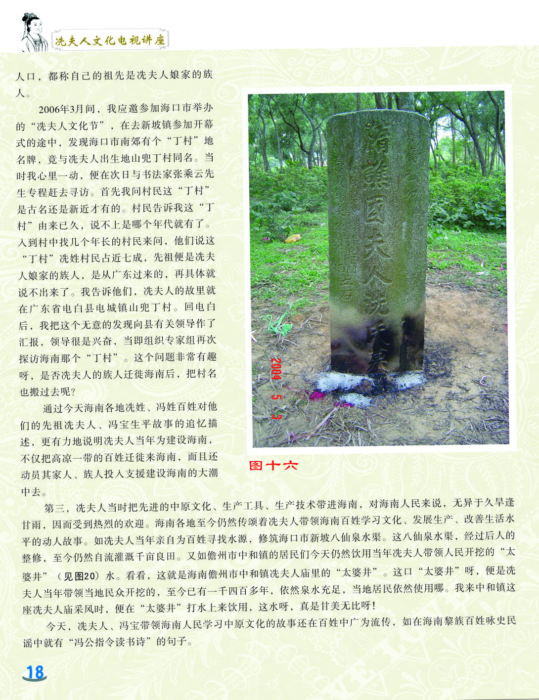 我细心地翻阅着这本小册子,第一感觉是这小册子非常精美,古色古香。第二感觉是内容图文并茂,深入浅出,用显浅的语言道出深刻的道理。内容共分六讲,第一和第二讲是关于冼太夫人的墓葬地以及故里问题,第三讲是关于冼太夫人在朱崖置州的故事,第四讲是关于冼太夫人为什么要派年仅九岁的儿子进京的问题,第五和第六讲是关于冼太夫人大义囚孙的故事以及冼太夫人的孙辈后人怎么以国家为重,坚决维护岭南乃至国家安定统一的故事。