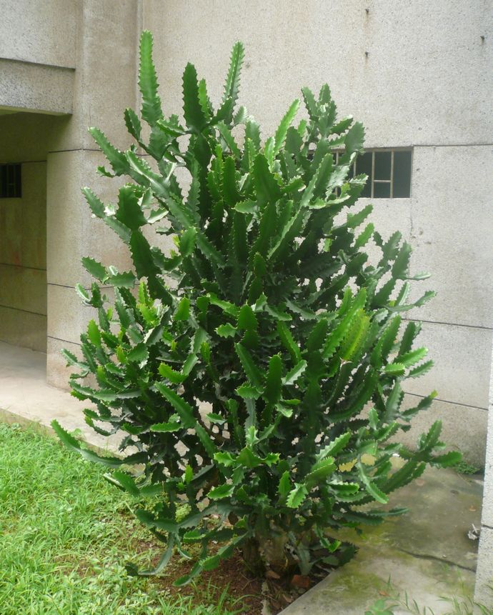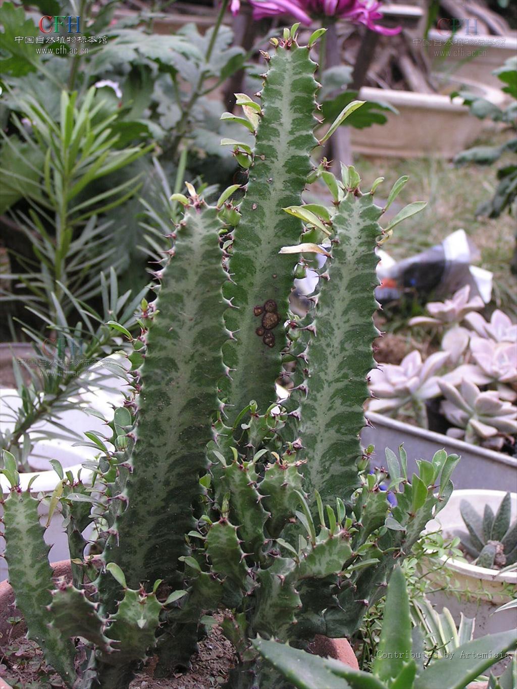 火殃勒(Euphorbia antiquorum Linn)常绿肉质灌木,形态像柱状的仙人掌,具有美丽的斑纹。在广东有人把火殃勒叫做霸王鞭,它的花比较小,很不显眼,但它挺拔的肉质茎和顶部浓密的像皮革一样的大叶子,四季常青,有点当年霸王所用钢鞭那种刚劲有力的威武劲头。因而旧时的花店都习惯在入口处各摆一盆霸王鞭,很多家庭也喜爱,它犹如两个手持钢鞭的守门卫士,具有辟邪的意思。