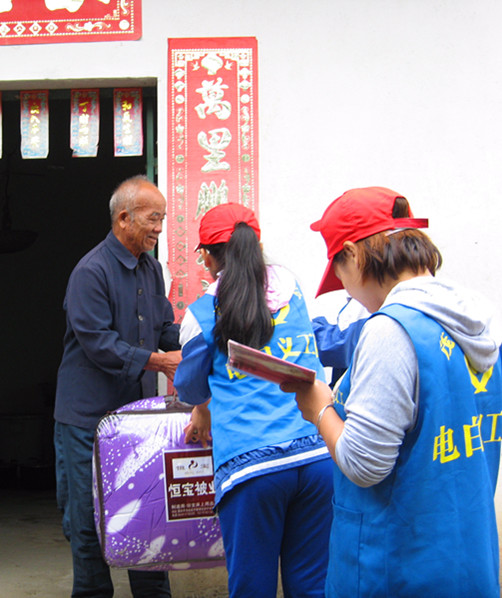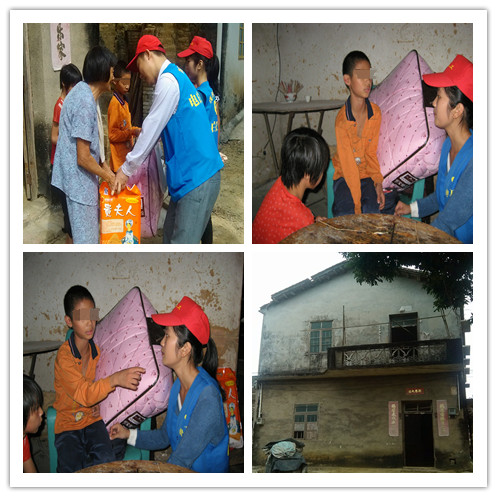 在向社会募集物资时,爱心老板给义工团捐赠一批大米、被子及生活用品。凝聚了社会爱心人士的支持与关爱,义工们分组把物资逐户送到46户五保、特困户、孤儿手上,义工带着爱心人士的慰问金转送给部分探访对象。
