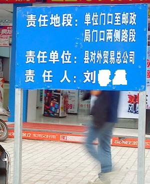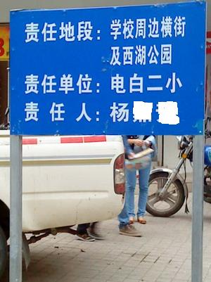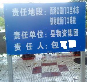 在水东多条街道路边树立着一块块铁牌匾,正面写着各行企事单位字样:正面写着责任地段:xxx,责任单位:xxx,责任人:xxx,而背面则写着:讲文明,除陋习,爱[洁,从我做起,电白是我家,[洁靠大家......等字词,这是什么概念,是否是包干到户?