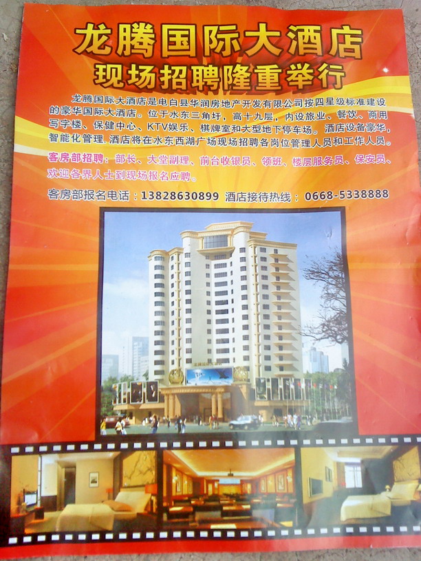 今天上午,龙腾国际大酒店在西湖角设台招聘各部门人员,几个招聘美女一字摆开,喇叭响亮,场面冷清,应聘人员寥寥无几,我说你们应选择东湖角。我待别人填表报名,是第一个,帮他们填补了空白,打破了零的记录。然后,我因没时间,索取了一张招聘广告就回来了,不知道后来会不会出现火爆应聘场面。