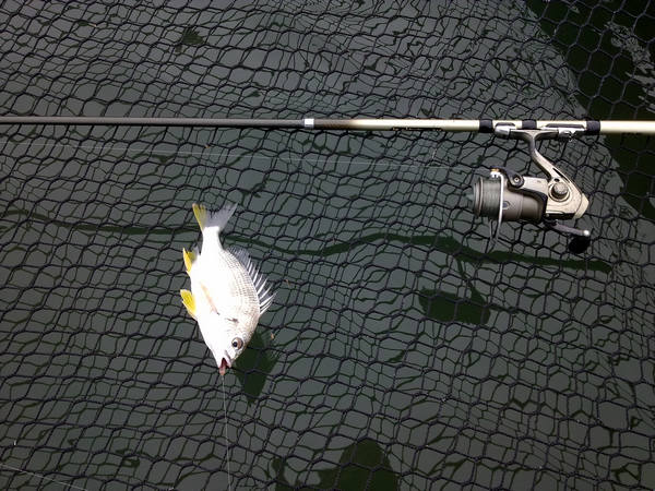 虽然冬天的日流特别细,但流水还是那么的汹涌,连表层都有喷涌般的奔流,不得不用上15克铅才勉强探底,还得小心的避着被流水冲得完全歪斜的网箱下钩.