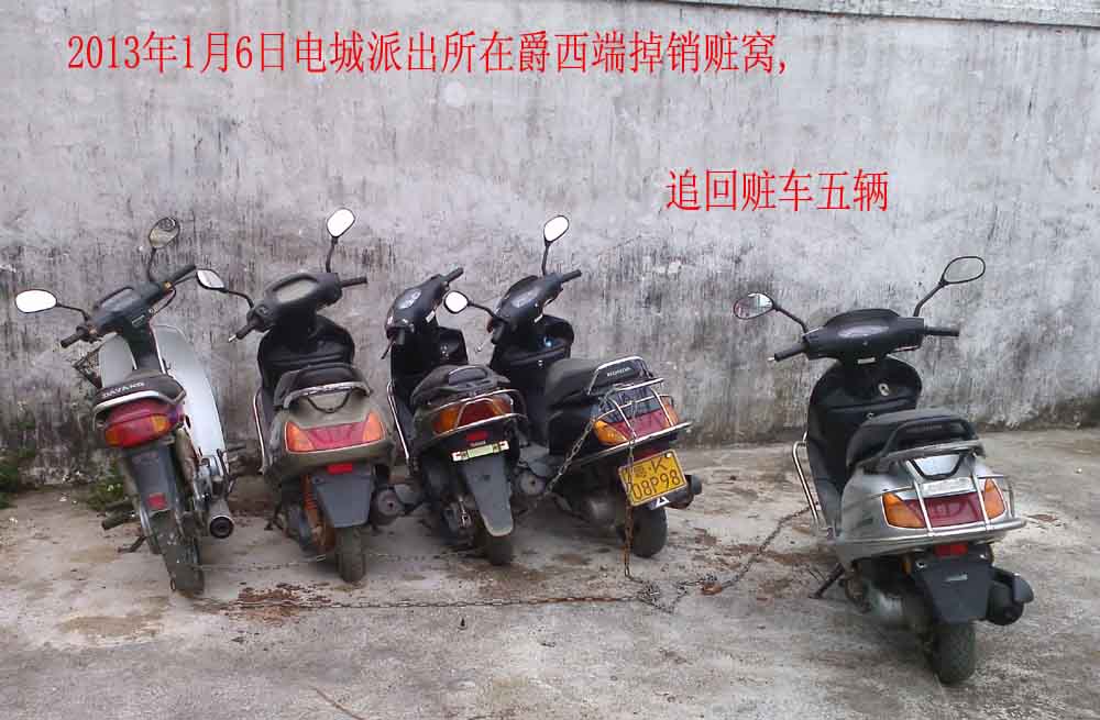 电城派出所2013年1月6日凌晨出动在电城爵西,端掉一销赃窝点,追回赃车五辆,刑拘一窝头杨x院,五辆赃车分是茂南两辆,茂港一辆,龙山一辆,水东一辆被盗摩托车车。