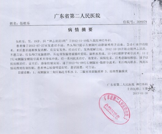 经过一段时间的治疗,桂乐的病情有所好转,头内的积水已经得到控制,现在正在进行康复治疗的阶段。可是让人担忧的是小乐他现在仍然很少说话,这段时间以来才模模糊糊的说了几句话。现在还没能走路,能坐轮椅了。 很感谢大家的关心和帮助,经过大家的努力我们利用论坛、QQ空间、微博筹得的善款有4仟多元。往后的有小乐治疗方面的好消息,我再和你们分享 [attachmentid=307749]