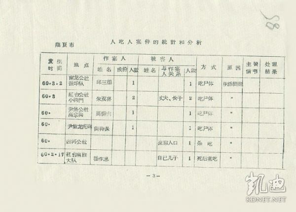 参加座谈会的敬根年老人退休前是县人大主任,当年是省冶金厅干部,是派来解决通渭问题的工作组成员,他说,1959年秋天,他们来这里看到炕上,路上,田间,地头,都躺着人,死人活人不分。工作组给还活着的人灌汤抢救。当时不怕死人怕活人。死人太多了,不怕。活人要吃人,害怕。人吃人的事发生不少。1960年2月,他到中林大队(属城关公社)抢救人命,大队长刘廷杰把他们领到王家庄,看到一家烟囱里冒烟DD那时候几乎家家是见不到炊烟的。他们进去的时候看锅里正煮着啥,大队长刘廷杰揭开锅盖的时候,他们看到锅里煮的是人肉,记得吃人肉的那女人是个麻眼儿(方言,指眼睛不好)。敬根年强调说:“这是我亲眼看见的。”