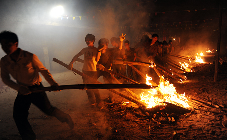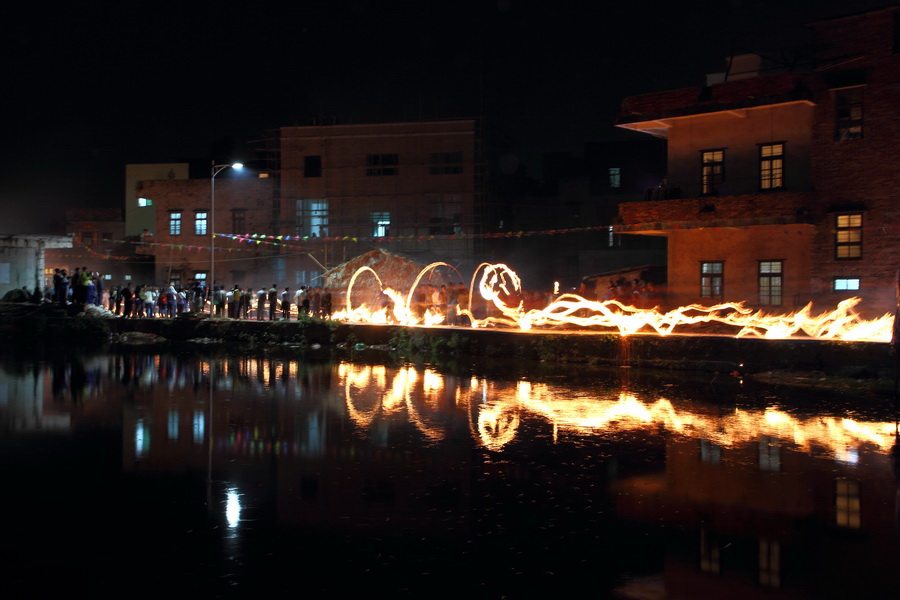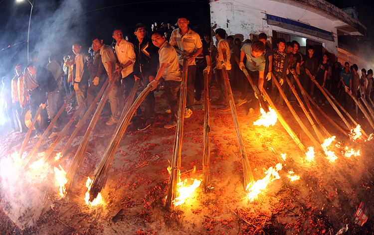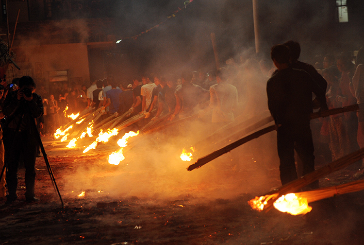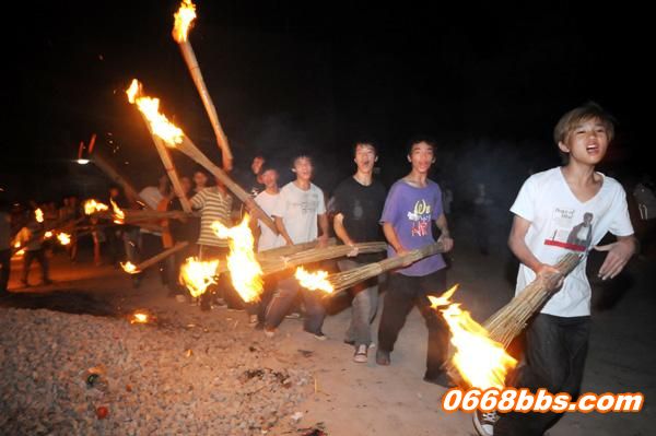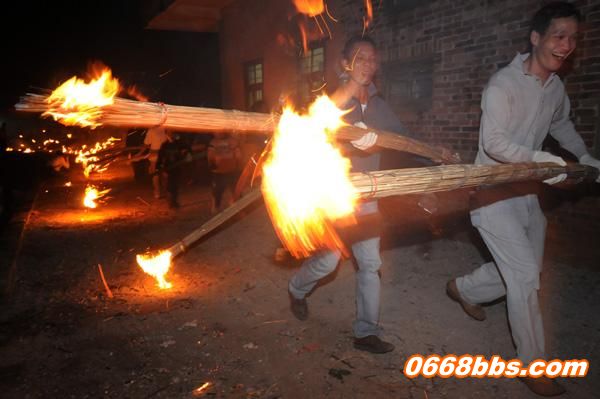 3月19日晚上至20日凌晨2点,电白县水东彭村的一块空地上,聚集了该村数百名青少年男子,他们人手握着一把捆成棒状的细竹篾,围着数堆烧得正旺的柴火,等待点燃火把。晚上12时,随着几声锣响和一阵阵鞭炮声响起,活动正式开始,现场的男女老少齐声呐喊,青少年男子一齐点燃火把,他们一边高声呐喊,一边举着火把,排着队沿着村中的一口鱼塘边鱼贯前行,长长的“火龙”向村中游去。数百支熊熊的火把组成的“火龙”沿既定的路线列队前进,穿过村道屋巷、走过田野,一条绚丽的“火龙”在夜色中逶迤穿行,蔚为壮观。据了解,游火龙这个传统风俗在彭村已有400多年的历史,以前只有建新房、娶媳妇、添丁的人家才有资格参加游火龙,称作‘参(三的意思)花’,现在很多年轻人都参加了。最初“游火龙”是用来驱邪的,现在变成了村民年例的狂欢节目。