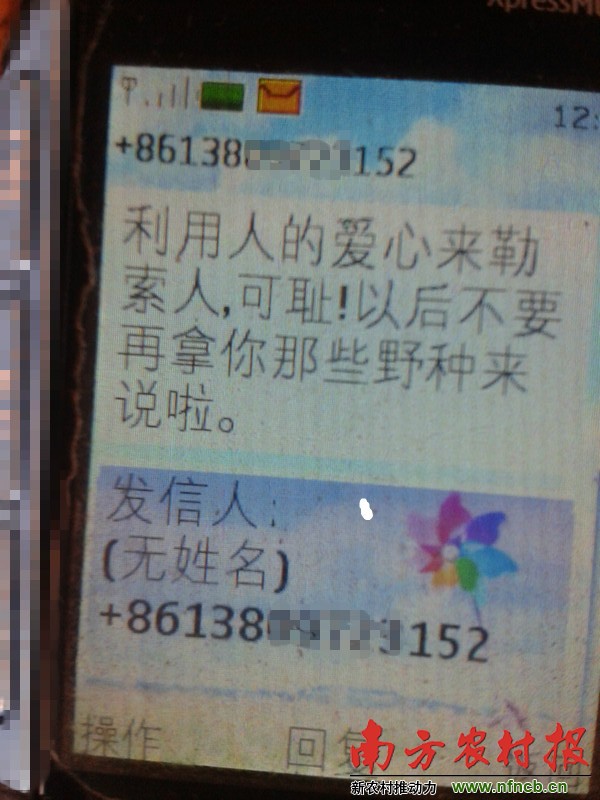 然而,围绕小孩的抚养费问题,李梅与何某亮的矛盾并未就此了结。李梅向记者展示的一条短信显示:“利用人的爱心来勒索人,可耻!以后不要再拿你那些野种来说啦。”经与何某亮所在单位有关人员核对,发信号码为何某亮常用手机号。李梅说,“何某亮怎么能骂自己的孩子为野种呢?”